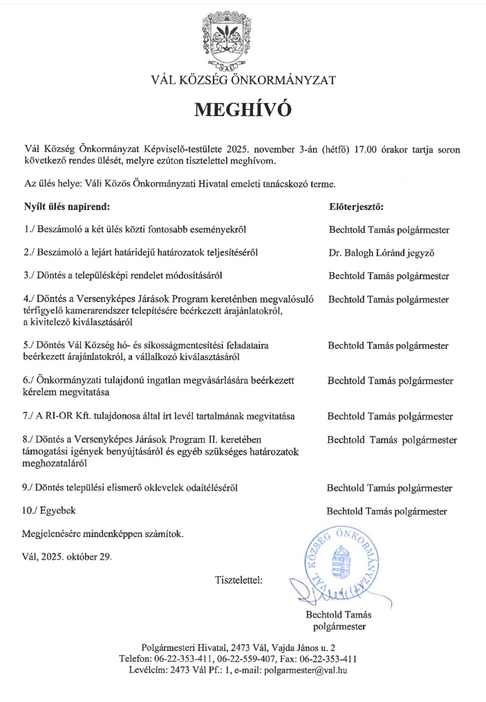Nagy szeretettel köszöntöm Önöket Vál község honlapján. Bízom benne, hogy minden szükséges információt megtalálnak a folyamatosan bővülő portálon, akár helyi lakosként, akár érdeklődőként látogatnak el internetes oldalunkra.