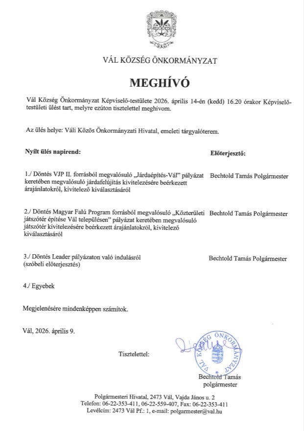 Nagy szeretettel köszöntöm Önöket Vál község honlapján. Bízom benne, hogy minden szükséges információt megtalálnak a folyamatosan bővülő portálon, akár helyi lakosként, akár érdeklődőként látogatnak el internetes oldalunkra.